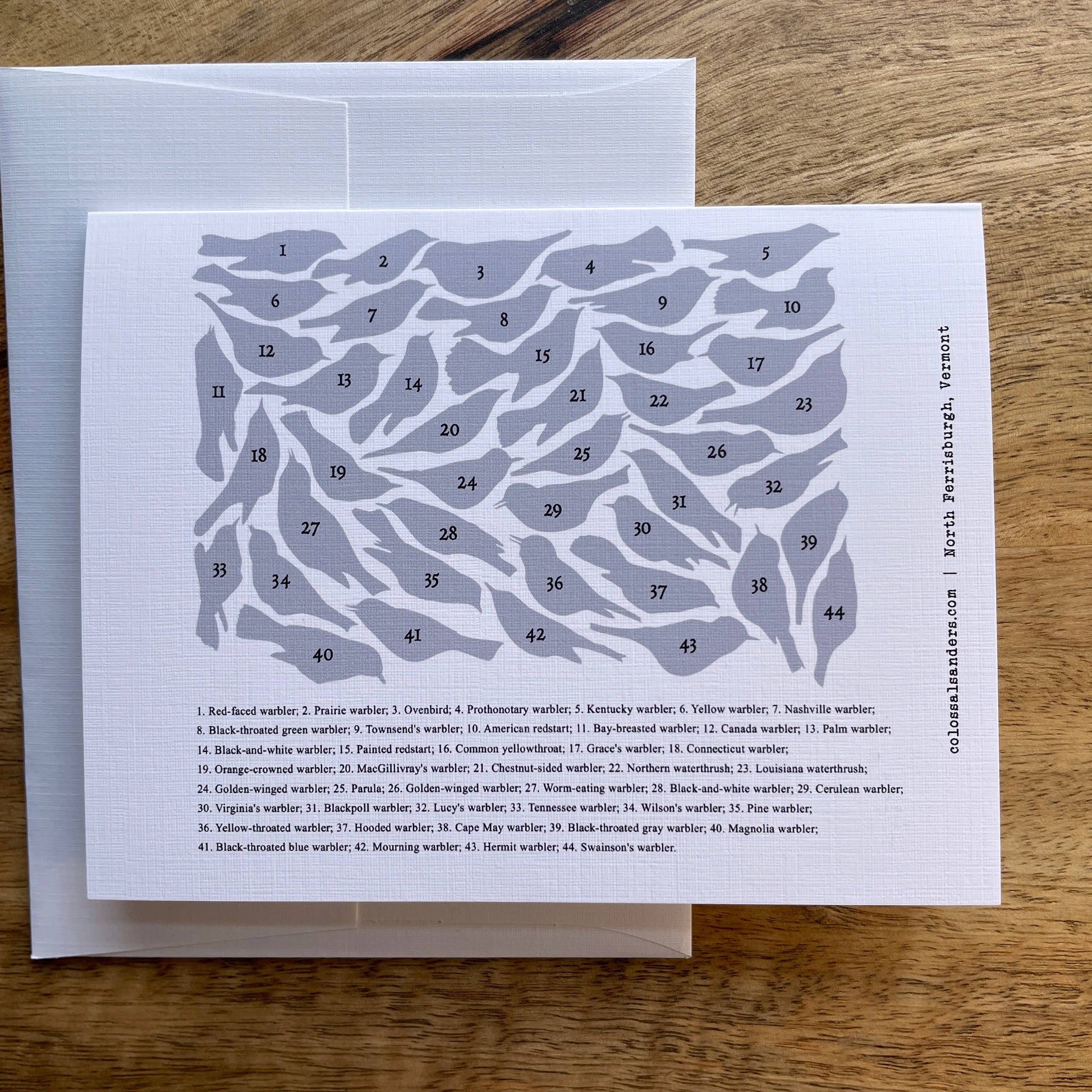 "Arranged Warblers" features 44 different North American warblers stylized and arranged by Colossal Sanders. Illustrations originally from the 1907 book, "The Warblers of North America." On the back of the card is a silhouetted numbered ID layout.
