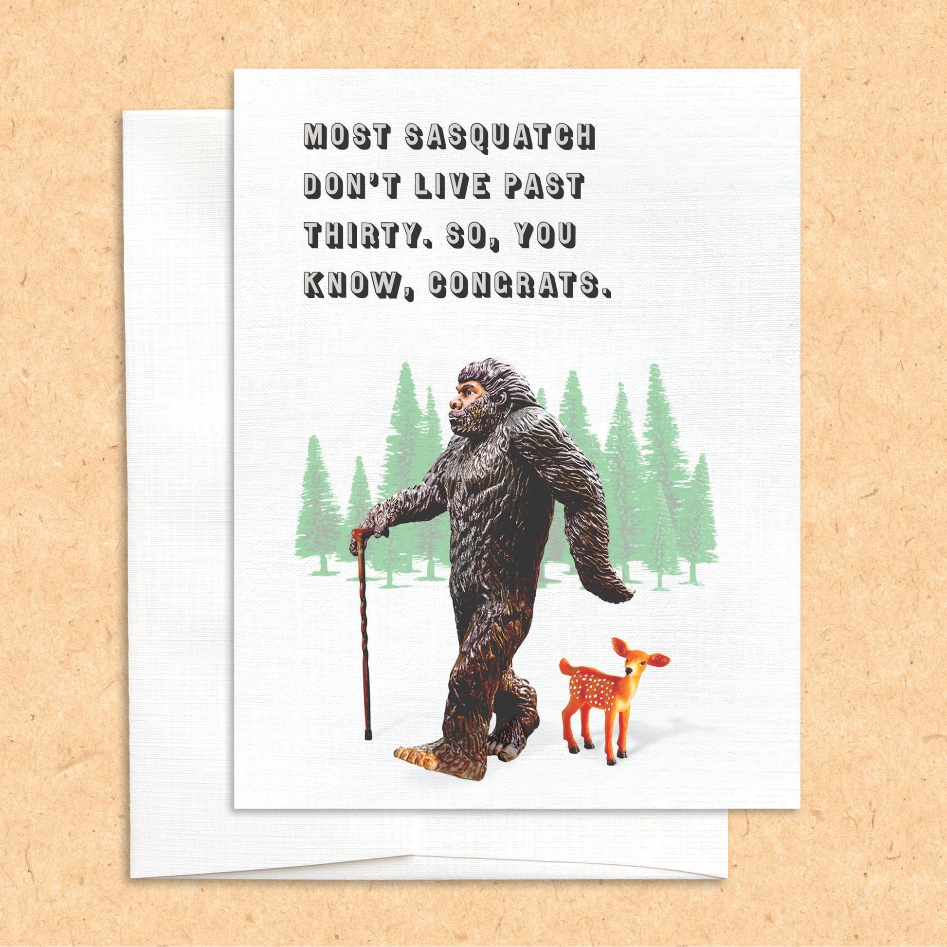 Text reads: "Most Sasquatch don't live past thirty. So, you know, congrats." Perfect for the aging sasquatch who can take a joke!