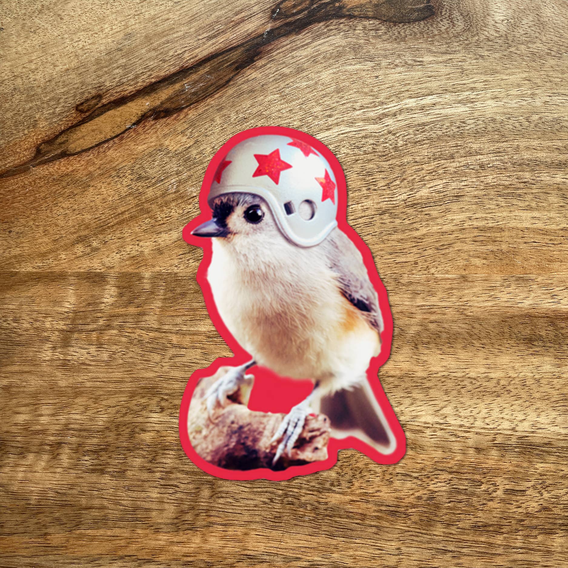 Some birds live dangerously, like this titmouse in a helmet. 1.75" x 2.5" vinyl, die-cut, all-weather sticker