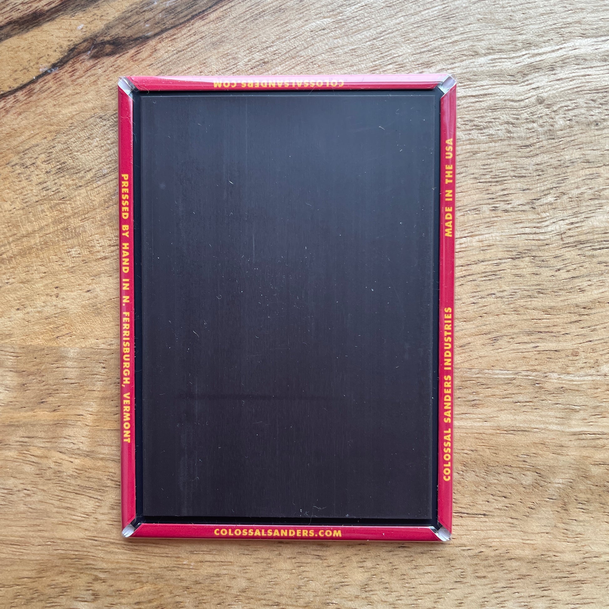 This 2.5"x3.5" magnet is curiously strong and pressed by hand in North Ferrisburgh, Vermont.