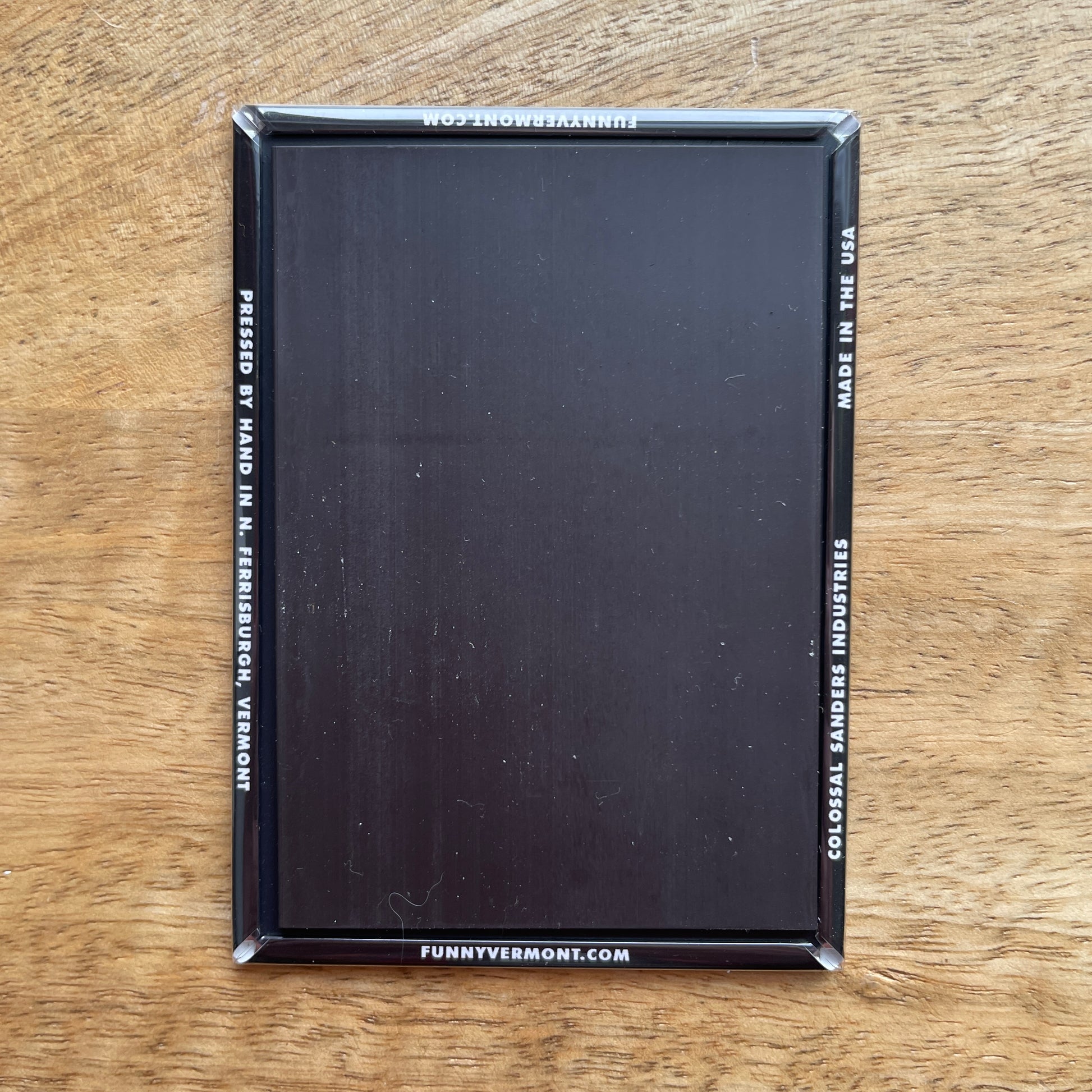 This 2.5"x3.5" magnet is curiously strong and pressed by hand in North Ferrisburgh, Vermont.