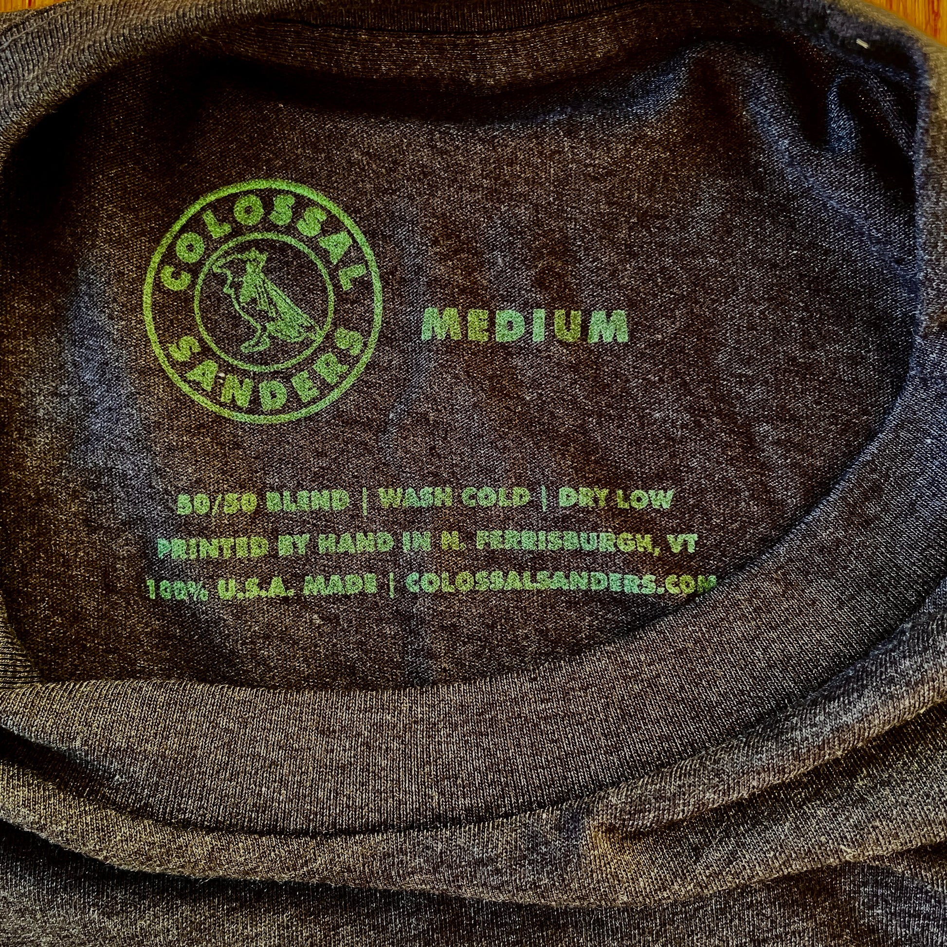 Printed on Heather Slate (dark gray) unisex 50% Combed Ring Spun Cotton, 50% Polyester Royal Apparel premium tee. Shirts made in the U.S.A. and screen printed by hand in Vermont at Colossal Sanders Headquarters.
