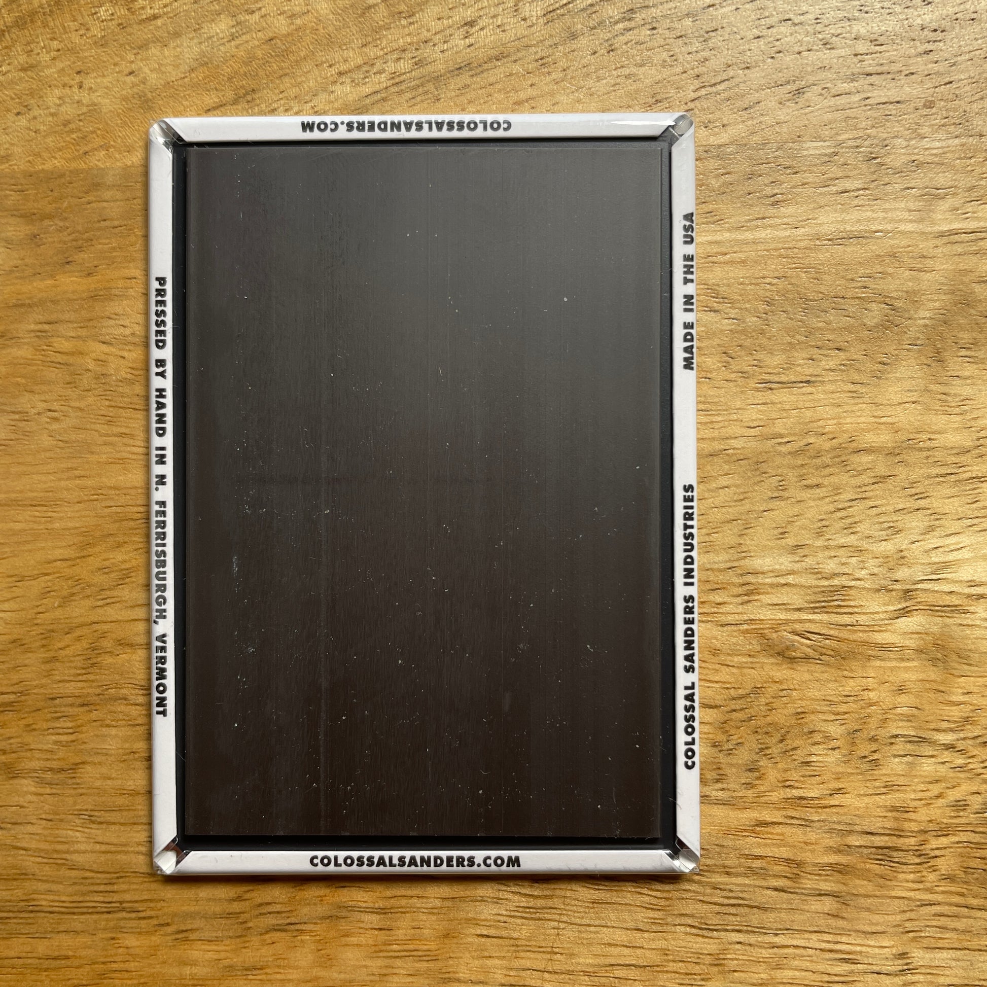 This 2.5"x3.5" magnet is curiously strong and pressed by hand in North Ferrisburgh, Vermont.