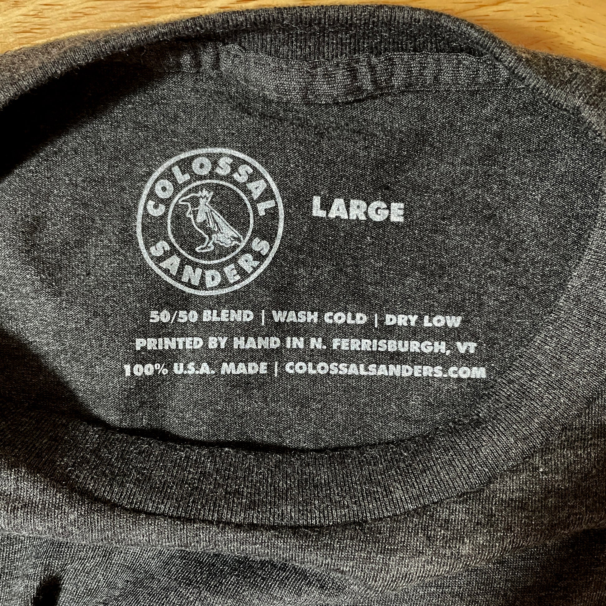 Printed on Heather Smoke (dark gray) unisex 50% Combed Ring Spun Cotton, 50% Polyester Royal Apparel premium tee. Shirts made in the U.S.A. and screen printed by hand in Vermont at Colossal Sanders Headquarters.