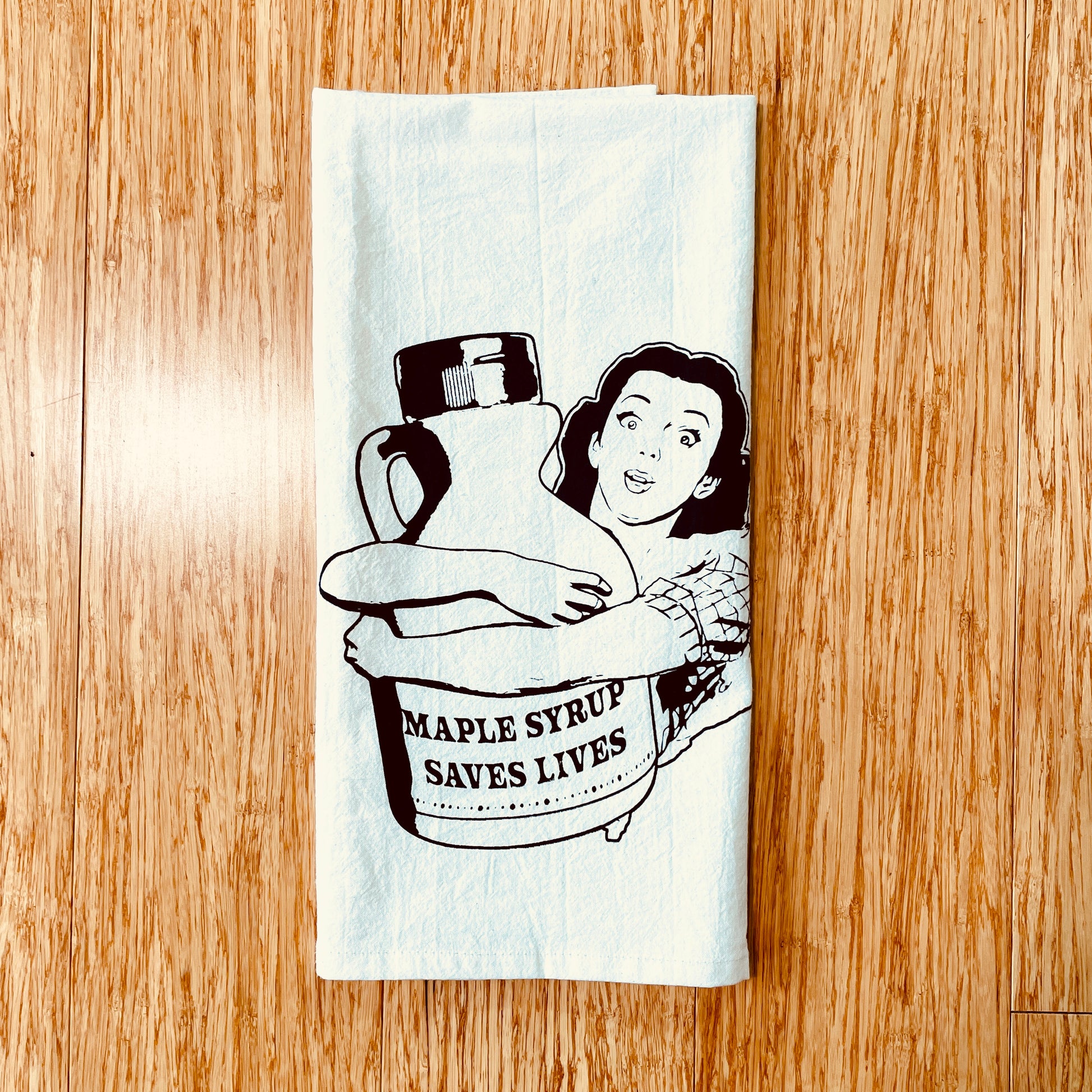 These natural 19x28-inch flour sack kitchen towels are printed on 130 thread count, 100 percent cotton, each with a corner loop and hemmed edges. Towels screen printed by hand in Vermont at Colossal Sanders Headquarters.