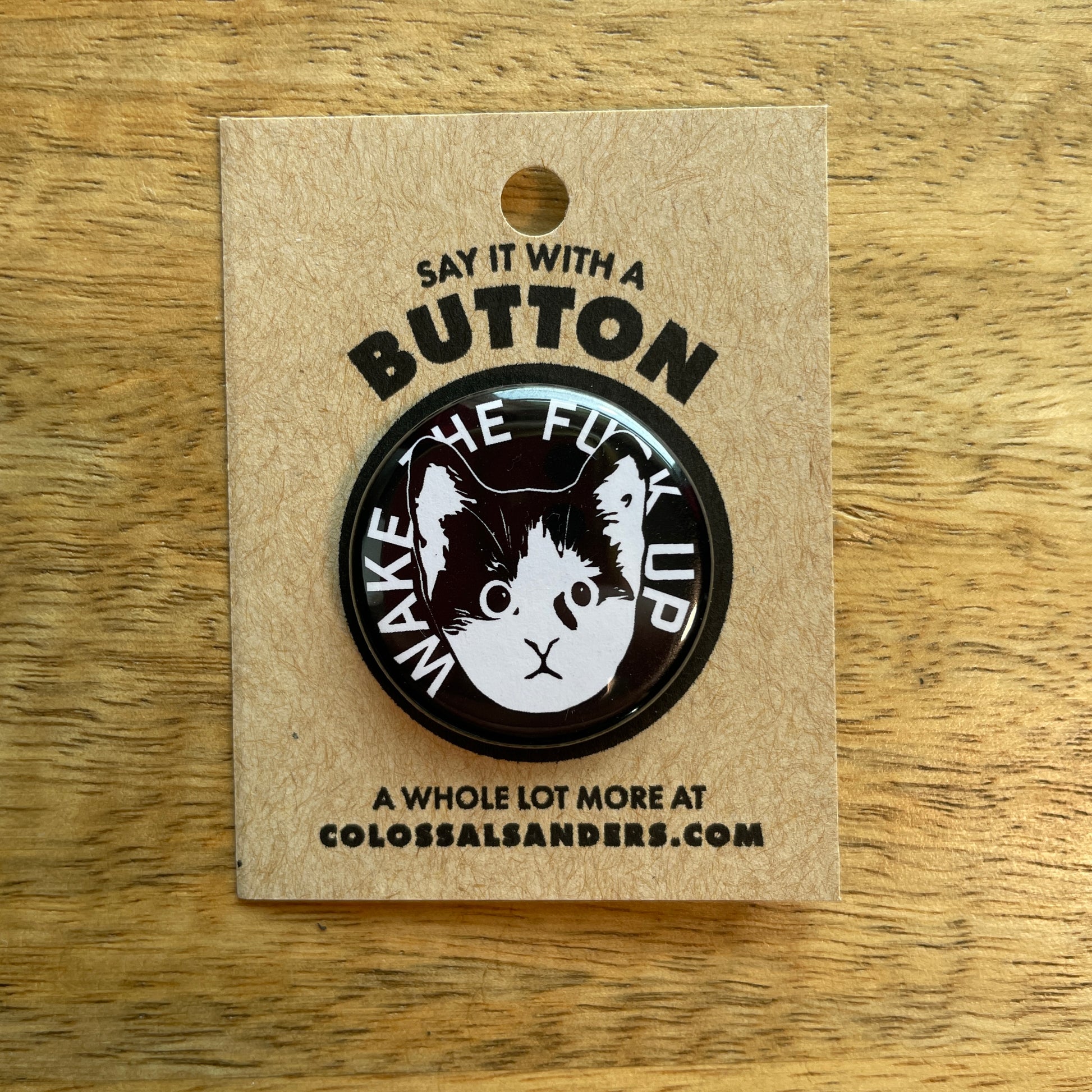 This concerned kitten comes as a 1.25-inch pin-back button or magnet. Buttons are available to be shipped loose or with gift packaging for 50 cents extra. Magnets ship loose.